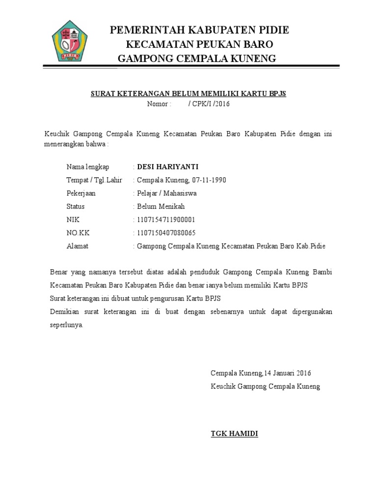 | Judul: Surat Keterangan Belum Memiliki Kartu Bpjs |